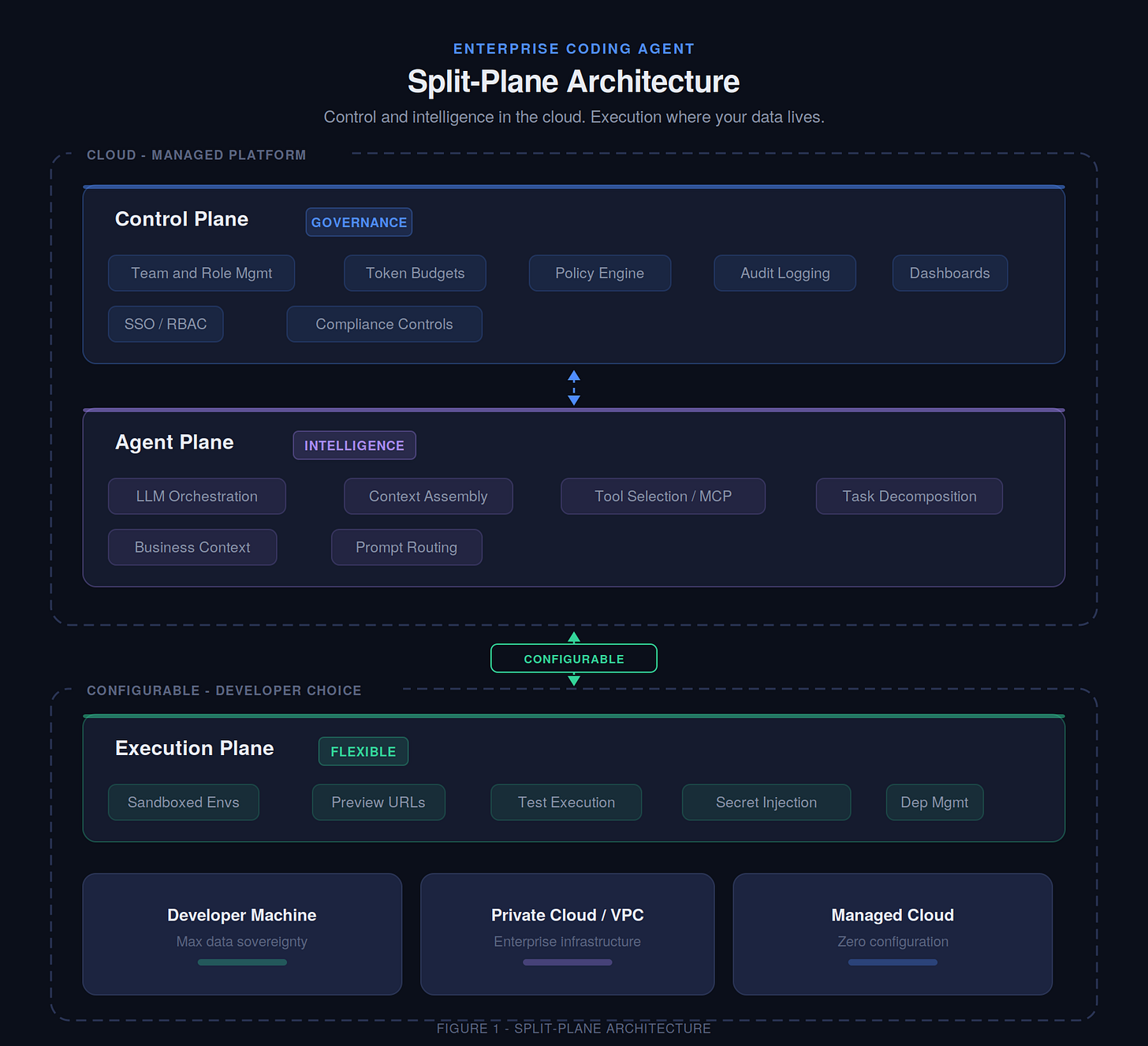 The execution plane is where builds, tests, migrations, and previews actually run. This must be flexible: local or customer-managed for sensitive code, cloud sandboxes for scale, and hybrid in many real organisations. Also, "code never leaves" is only true if prompts, retrieval, logs, embeddings, and telemetry are kept inside the same boundary otherwise leakage still happens through the side doors.