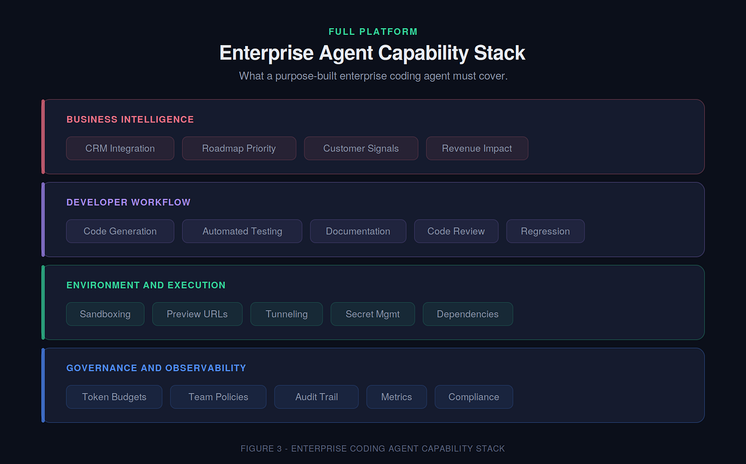 The biggest missed opportunity is business context. Enterprises don't want an agent that only writes code faster. They want an agent that helps ship the right things: bugs creating support load, features blocking deals, recurring incidents, and technical debt that is strategically painful.